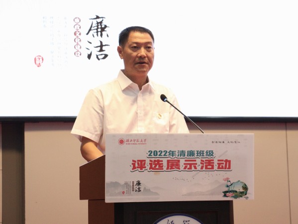 余涛为活动致辞。他谈到创建清廉班级是学校推进清廉湖师建设,实施“七清工程”,推进“五廉建设”的重要载体之一。各班级积极探索、勇于实践,为弘扬廉洁文化贡献了智慧和力量,形成了良好的经验做法,值得学习推广。为加强党团班级建设,营造崇清尚廉、文化育人的良好氛围,他提出三点希望:一是强规矩意识,壮班级发展之根;二是行廉洁之举,强班级干部之力;三是扬清风正气,聚班级文化之魂。他希望同学们积极学廉践廉,激发向上向善、清风正气的社会文明新风,以实际行动献礼党的二十大胜利召开。