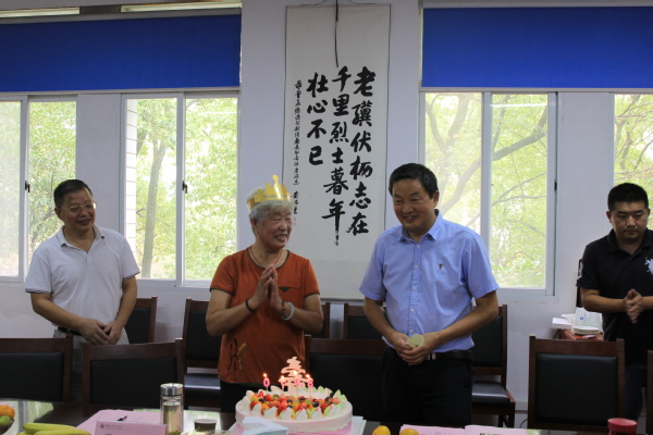 在生日快乐的歌声中,雷儒金还与老同志同切生日蛋糕,并将蛋糕送到老同志手中。