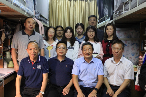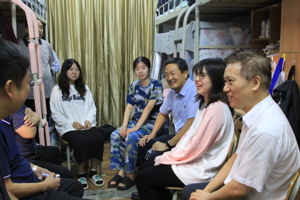 在宿舍里,雷儒金与同学们进行深入亲切的交谈。“在学校吃得习不习惯?”“军训衣服晚上洗后能不能干?”“老家哪里?”“什么专业?”等等,从生活到学习,从个人到集体,他细致入微,耐心询问同学们到校后的适应情况以及今后的学习规划,一再叮嘱学生,一定要养成良好的生活习惯,不能熬夜,遇到任何困难要及时向老师反馈。得知宿舍同学都在积极申请加入各级学生组织时,他高兴地说道“良好的开端就是成功的一半,大家相互比学赶超,形成良性循环良好学风,要把这种拼劲干劲保持并发扬下去”。