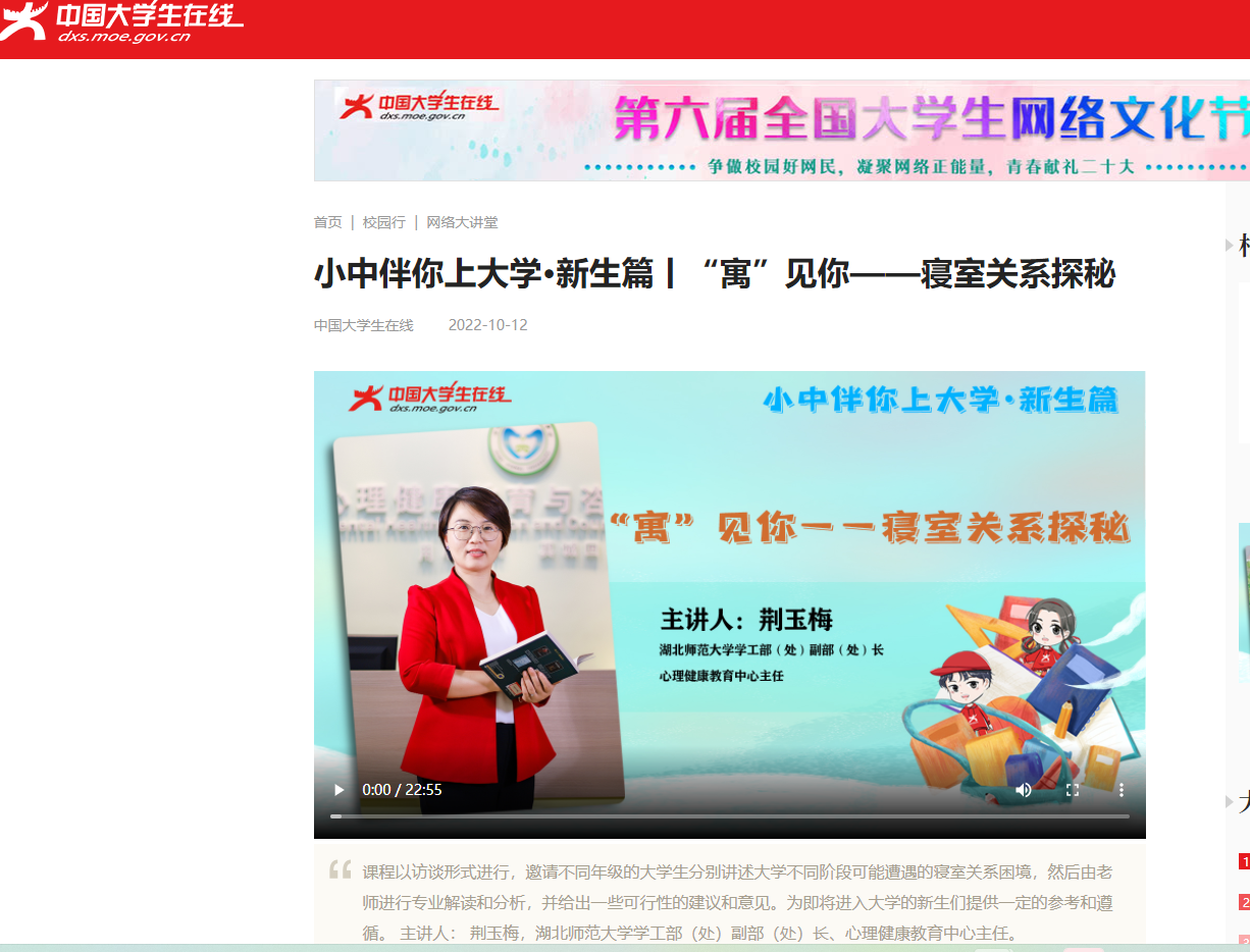 本网讯 近日,从教育部中国大学生在线获悉,我校荆玉梅老师录制的《“寓”见你——寝室关系探秘》线上课程成功入选2022年中国大学生在线网络共享课,并于10月12日在中国大学生在线官网(dxs.moe.gov.cn)及新媒体平台播出。