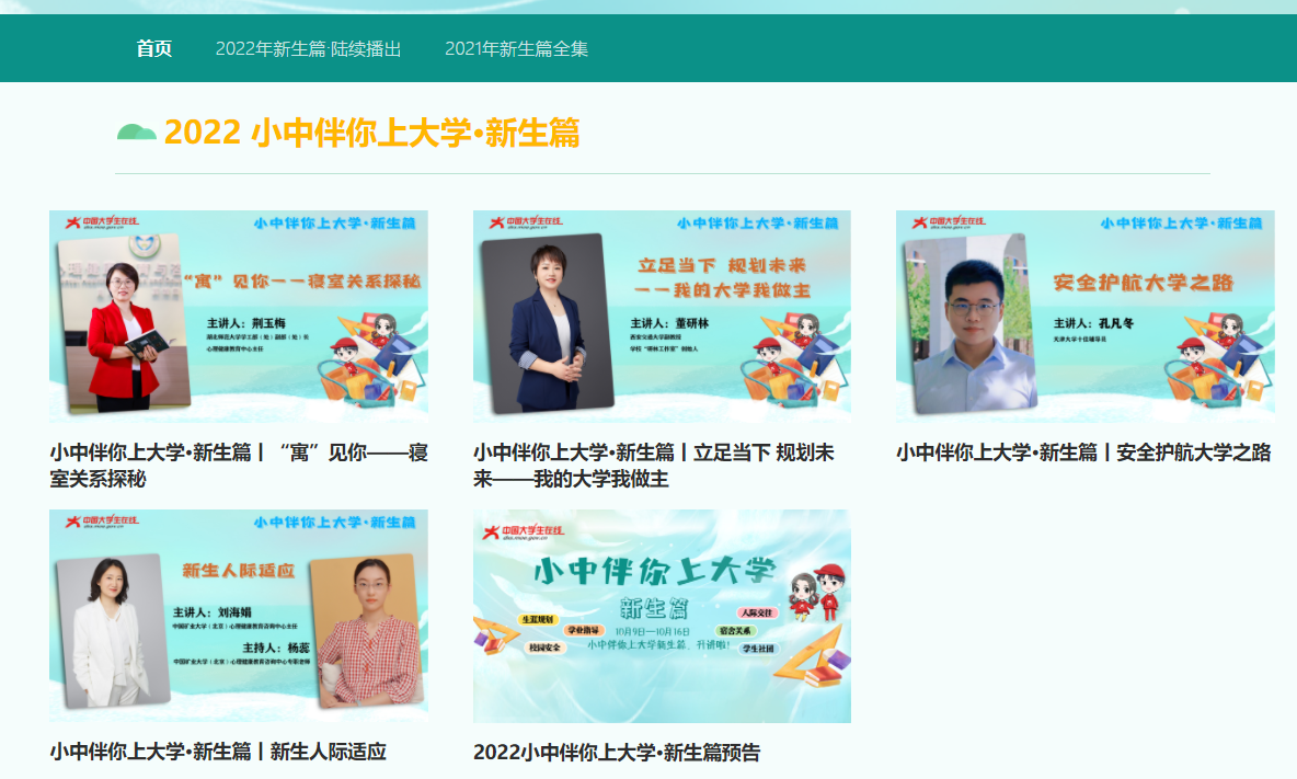 此次活动由教育部思想政治工作司指导,中国大学生在线主办,围绕大学新生适应主题面向全国进行广泛征集,经专家学者遴选,最终有来自浙江大学、北京航天航空大学、西安交通大学等高校在内的8门课程成功入选,课程内容涵盖生涯规划、学业指导、校园安全、人际交往、宿舍关系等。