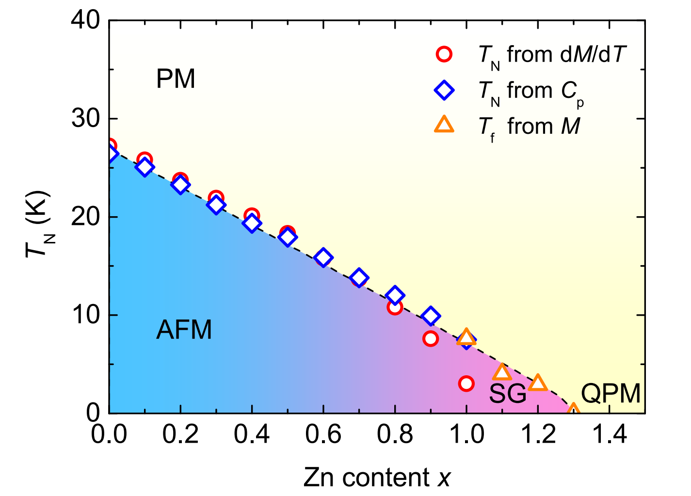 本网讯 Kitaev模型是建立于二维六角蜂窝晶格的量子自旋液体模型,并伴有马约拉纳费米子激发和衍生规范场,在未来的量子计算中具有潜在应用价值。其中,Kitaev相互作用是该模型的核心,在真实体系中实现它成为了当前强关联电子领域的一个中心话题。最近有研究指出,具有蜂窝晶格的3d电子钴氧化物Na2Co2TeO6中存在Kitaev相互作用,但是非Kitaev项使系统在低温时发生反铁磁相变。我校先进材料研究院马祯团队利用无磁离子Zn2+对母体中的Co2+进行部分替代,从而引入自旋缺陷,尝试在不破坏晶体结构的基础上对基态进行调控。研究发现,母体的反铁磁基态对Zn2+掺杂很不敏感,在掺杂量x = 1.0时长程磁序才被完全抑制。随着掺杂浓度的增加,系统进入短程有序的自旋玻璃态,最终在x ≥ 1.3时转变为顺磁态。以上结果清晰记录了系统磁基态的演变过程,并给出了Na2Co2-xZnxTeO6的磁相图。该工作表明,Zn2+掺杂可以作为增强量子涨落的一种手段,并可能诱导出与自旋液体有关的量子顺磁行为。