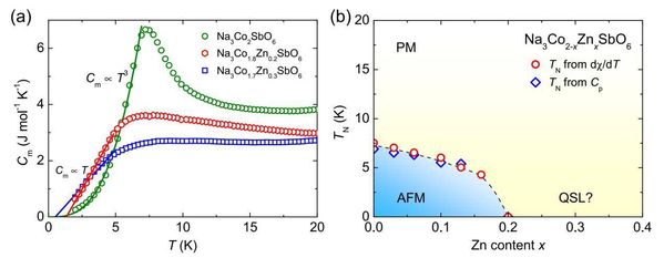 Kitaev量子自旋液体代表一种新奇的量子物态,具有拓扑序,存在服从非阿贝尔统计的任意子激发,可用来构建拓扑量子比特,在量子计算和信息存储等领域具有潜在应用价值。近年来,在真实材料中实现量子自旋液体成为了凝聚态物理的一个前沿科学问题。继不久前,马祯博士团队对3d电子钴氧化物Na2Co2TeO6的研究证明了Zn2+掺杂可抑制系统的长程磁序之后[PRM 7, 014407 (2023)],他们对另一种Kitaev量子磁体Na3Co2SbO6的研究获得了更有意思的结果。研究表明,Zn2+的引入可有效抑制母体的磁相变温度,相变在x ≥ 0.2时完全消失,系统进入既无长程磁序、也无自旋冻结行为的磁无序态。更重要的是,磁无序样品的磁比热在低温时表现为线性行为,这和母体的反铁磁基态中磁比热与温度呈立方关系的行为形成鲜明对比,是确认分数化元激发行为的重要信号,提供了证实量子自旋液体态的重要证据。