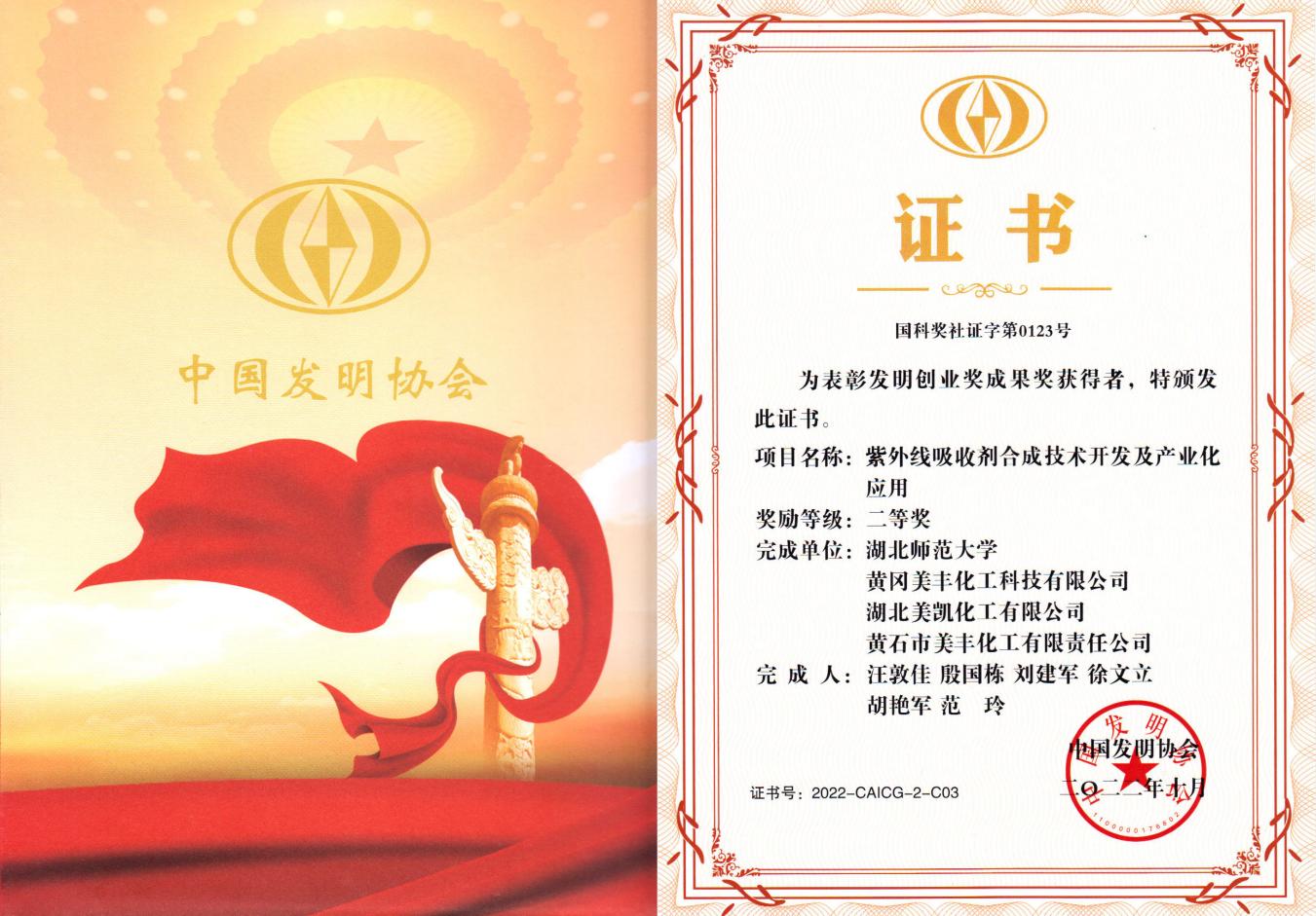该奖项由我校与黄冈美丰化工科技有限公司等共同申报,我校为第一完成单位,完成人为化院汪敦佳教授、殷国栋教授、胡艳军教授、范玲副教授。该研究团队经过十几年持续与美峰集团的校企合作,专注于紫外线吸收剂合成关键技术、新产品研发以及绿色化工艺改造等关键技术难题,提升了紫外线吸收剂关键技术自主创新能力,推动了行业技术进步和发展。近年来,团队成员申请国家专利43件,获得授权专利37件,其中发明专利19件,实用新型专利18件;获得中国产学研合作创新奖1项、湖北省技术发明奖二等奖1项、湖北省科技进步奖三等奖6项,并发表SCI收录论文100余篇。在国家、省市和横向项目等30多个课题的支持下,团队完成了20多项小试与中试试验,争取到1500多万元的项目经费资助,校企合作成果“紫外线吸收剂系列产品合成技术”相继投入工业生产。近三年,该项目为地方新增产值13.56亿元,新增利税2.39亿元,创汇1.48亿美元。