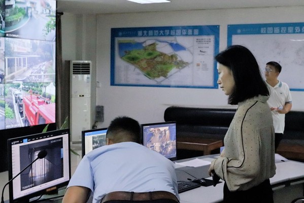 在安防监控中心,刘丹青听取了校园安防监控体系建设运行情况汇报,观看了重点区域监控平台、校园周界监控平台的实时演示。