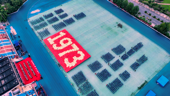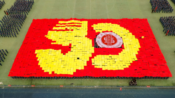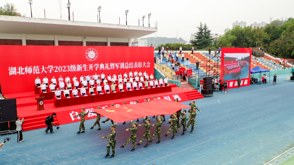 典礼在欢快的青春歌舞串烧和新生合唱的《强军战歌》中拉开帷幕。校国旗班护送大幅国旗入场,伴随着庄严雄壮的国歌声,五星红旗冉冉升起。随后,17个学院方阵和学工教师代表方阵踏着整齐的步伐、喊着嘹亮的口号依次走过主席台接受检阅,新生拳法、掌法、步法表演及教官擒拿格斗术精彩纷呈。2100人方阵通过阵型变化,高喊“自强不息,尚诚厚德”的湖师精神展现出“1973”“2023”和校庆50年标识,场面十分震撼。
