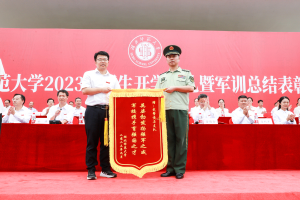 军训汇演结束后,校党委书记李宏向承训单位赠锦旗。党委常委、统战部部长肖六亿宣读2023级新生军训表彰文件,并依次颁发“新生军训标兵”“内务优秀寝室”“综合表现优秀奖”及“优秀教官”奖。