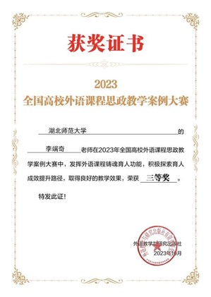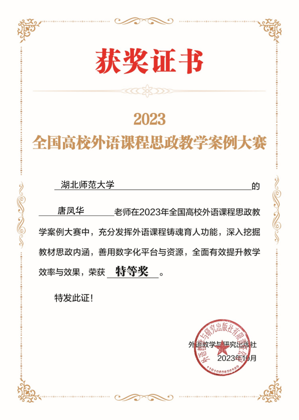 本网讯 10月9日,2023年全国高校外语课程思政教学案例大赛公布获奖名单,我校外国语学院斩获两项荣誉,唐凤华老师荣获特等奖,李端奇老师荣获三等奖。