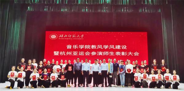 会上,校领导为参与亚运会的4位领队老师和39位同学进行颁奖,师生们依次接过证书,与此同时也接过了一份荣耀、一份信任和一份责任。受表彰的师生对学校的悉心栽培表达了衷心感谢,并表示在今后的学习工作中将秉承亚运会精神,用心对待每一次演出,竭尽全力完成每一次任务,以奋勇拼搏、昂扬向上的精气神展现湖师人的使命担当。