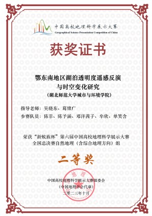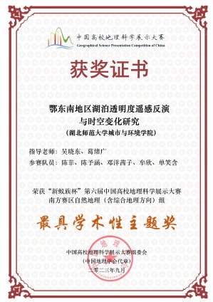 本网讯 近日,2023年“新蚁族杯”第六届中国高校地理科学展示大赛比赛结果公布,我校吴晓东、葛绪广两位老师指导的作品《鄂东南地区湖泊透明度遥感反演与时空变化研究》以总分第一的优异成绩获全国总决赛二等奖,南方赛区自然地理组一等奖、最具学术性主题奖和最具创新性主题奖。