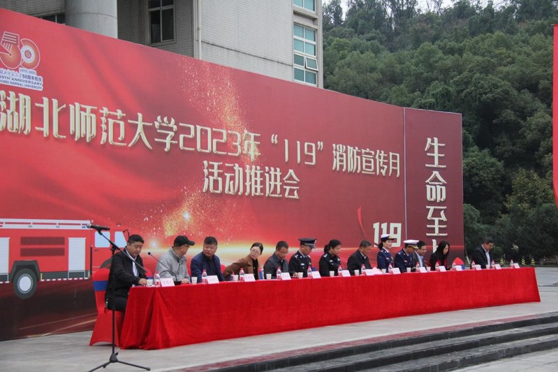 本网讯 为增强广大师生的消防安全意识,营造良好的消防安全环境。11月11日上午,学校联合黄石市消防救援支队共同举办“119”消防宣传月推进会。校长雷儒金,黄石市消防救援支队党委委员、副支队长任苇,黄石港公安分局党委委员、副局长吴春燕,黄石港区消防救援大队大队长孟飞,沈家营派出所所长石水池出席活动。活动由保卫处副处长汪贵生主持。