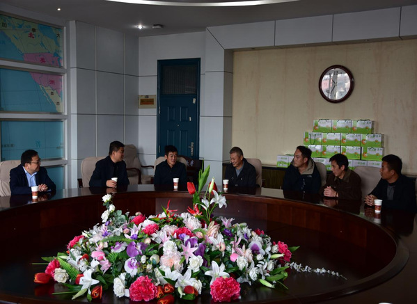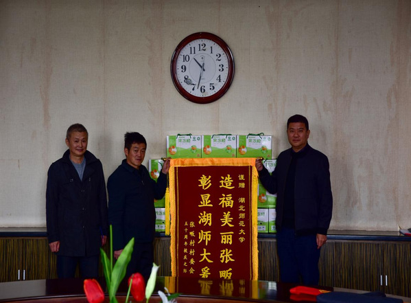 本网讯 50周年校庆期间,学校收到来自阳新县浮屠镇张畈村赠送的一面印有“造福美丽张畈 彰显湖师大爰”的锦旗,和学校支持援建的“金惠果园”所出产的阳光果冻橙一批。校党委副书记马列军接待村两委一行并开展了座谈交流。