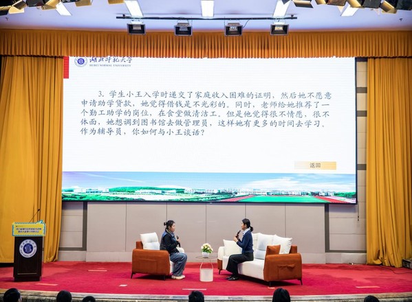 在辅导员素质能力大赛决赛中,8名经学情认知和笔试考核胜出的辅导员同台比拼,他们通过案例分析和谈心谈话展现各自的业务能力和专业素养。案例分析环节,大家在“我提问,你回答”的过程中研讨交流,共促思考。谈心谈话环节,辅导员与学生“一对一模拟访谈”,有效帮助学生纾困解难,给予正确建议和引导。