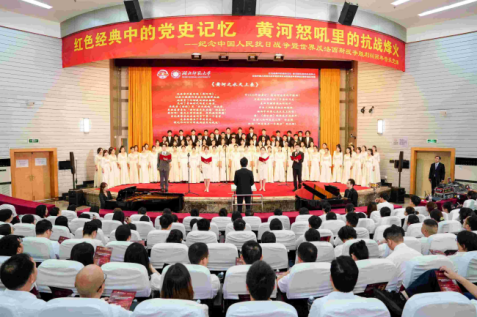 党课以冼星海《黄河大合唱》为纽带,通过艺术演绎再现中华民族的抗战史诗。混声合唱《黄河船夫曲》以磅礴气势展现黄河儿女的英勇抗争;男中音独唱《黄河颂》讴歌民族精神;改编朗诵《黄河之水天上来》串联大别山烽火、抗洪救灾、抗疫斗争等时代篇章,彰显中国共产党领导下的人民力量。《黄水谣》《保卫黄河》等经典曲目依次呈现,带领观众重回全民抗战的峥嵘岁月。最后,全体齐声合唱《国际歌》,激昂的歌声在报告厅内久久回荡,将现场气氛推向了最高潮,也为这场音乐党课画上了圆满的句号。