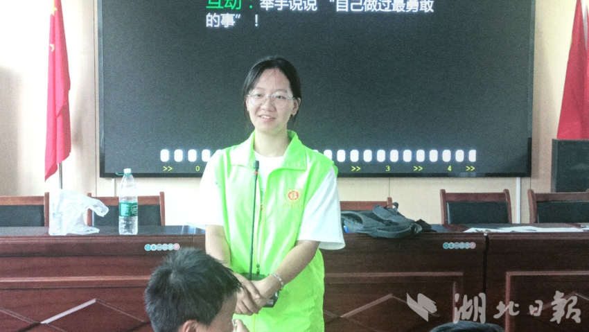 志愿者陆子涵以“光影叙事”切入,通过历史照片和动画短片引出“小兵张嘎”的英雄事迹。志愿者通过列举张嘎虽然害怕但仍勇敢站出来等例子和孩子们共同探讨、分析张嘎的勇敢和聪明才智,引导孩子们从细节中更深刻地认识小英雄张嘎,理解抗日精神的具体内涵。最后,志愿者通过设置互动环节,让孩子们分享自己做过的勇敢的事,形成“英雄精神——生活实践”的认知闭环。