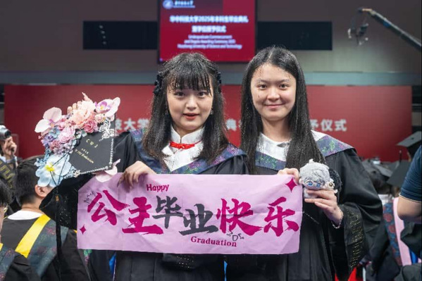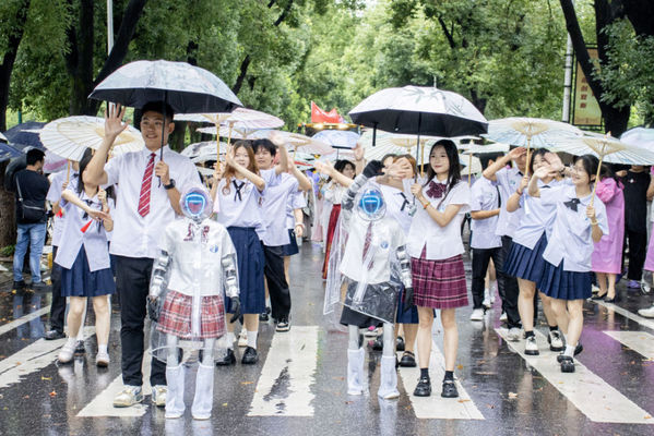 6月21日,华中农业大学2025年“异曲同工”毕业巡游活动如约而至。同学们踏着欢快的音乐沿着樱花路行进,一路载歌载舞,不时驻足与道路两旁的师生家长互动。青春洋溢的舞蹈引得围观者纷纷拿出手机记录这美好的瞬间。图为工学院队伍中“工小蓝”和“工小粉”两位人形机器在机车前领航。