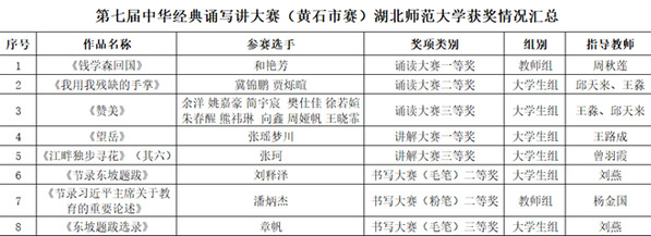 本网讯 近日,黄石市第七届中华经典诵写讲选拔赛结果揭晓,我校师生表现优异,共获得一等奖2项,二等奖3项,三等奖3项。