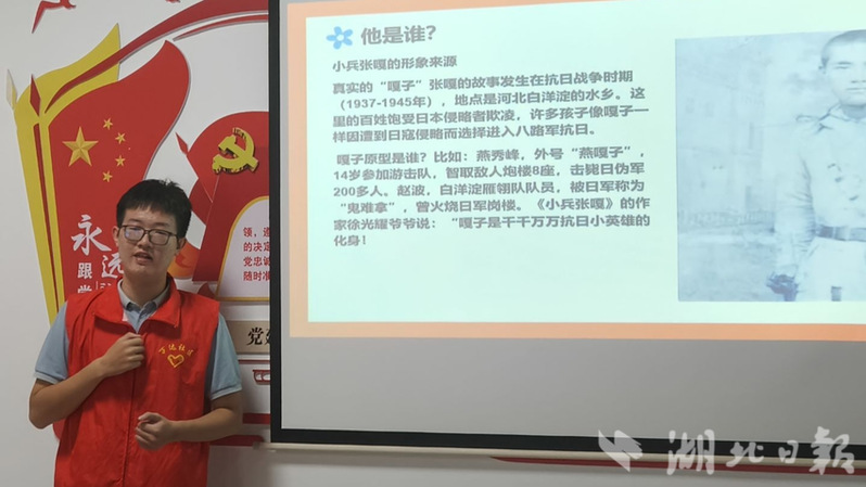 在师院社区,宣讲团成员曹梦琪围绕1943年日军“五一”大扫荡的时代背景,生动讲述嘎子因亲人被害,从一个普通少年在战火中成长为合格战士的历程。她着重阐述嘎子在抗战中的突出功绩,深入剖析其勇敢倔强、聪明机智的形象,让孩子们深刻感悟到了抗战精神的内涵与传承价值。