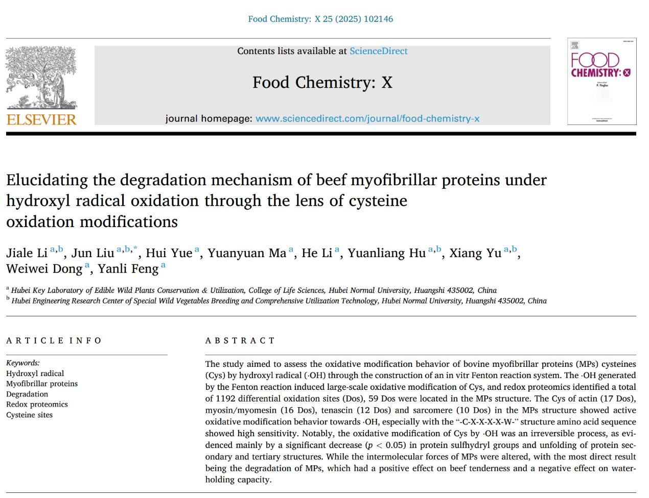 论文信息:LI J, LIU J, YUE H, et al. Elucidating the degradation mechanism of beef myofibrillar proteins under hydroxyl radical oxidation through the lens of cysteine oxidation modifications[J]. Food Chemistry: X, 2025,25: 102146.