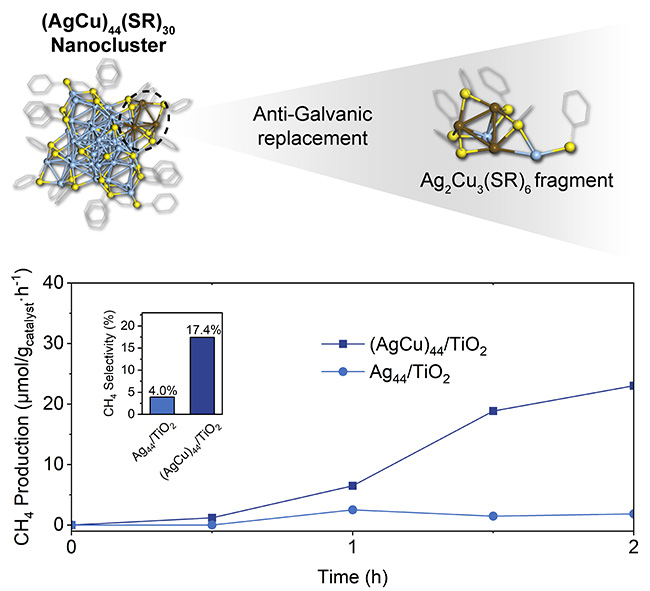 理解双金属催化剂的结构-活性关系对于设计高效催化体系具有重要意义。在该研究中,刘野博士及其所属研究团队成功地在具有原子级精确结构的Ag44纳米簇中引入了多达六个Cu原子。研究发现,在 (AgCu)44结构中,铜原子表现出特定的占位偏好,主要占据在中间层的Ag20十二面体和外层的Ag2(SR)5硫配位单元中。理论与实验研究均表明,Cu原子的引入有利于调控电荷载流子分布,并有效促进载流子在纳米簇内部的空间分离。在光催化 CO2还原反应中,与单一金属组分Ag44纳米团簇敏化的TiO2复合催化剂相比,双金属(AgCu)44纳米团簇敏化的催化剂表现出约两倍的催化活性提升,且对 CH4的选择性提高了约三倍。这一研究成果为设计高效双金属光催化材料提供了新思路,对推动CO₂资源化利用和清洁能源开发具有重要意义。