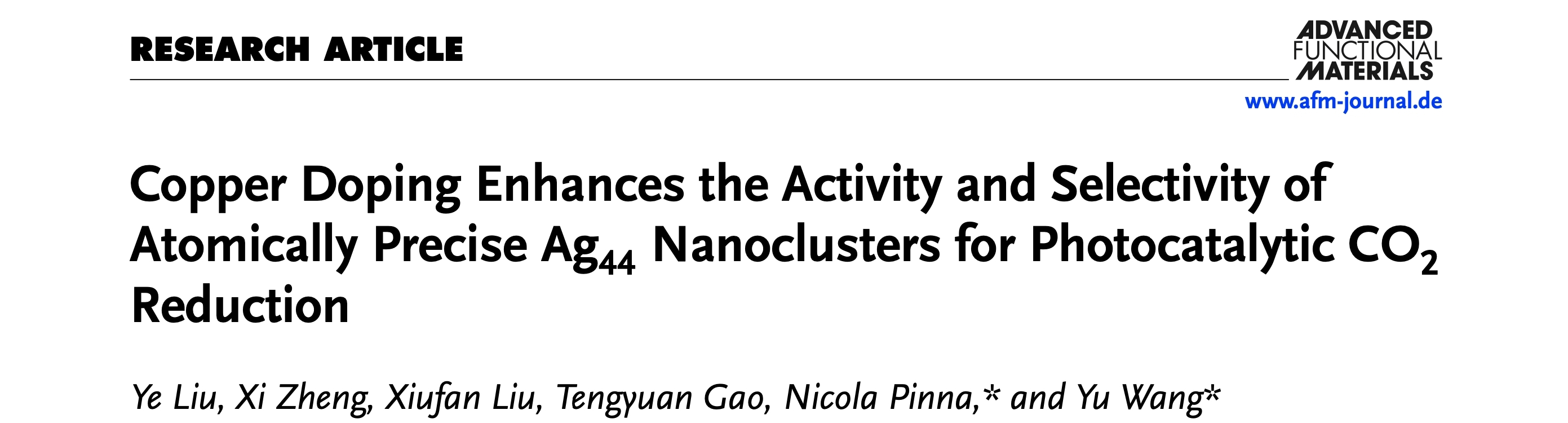 Copper Doping Enhances the Activity and Selectivity of Atomically Precise Ag44 Nanoclusters for Photocatalytic CO2 Reduction.Ye Liu,Xi Zheng, Xiufan Liu, Tengyuan Gao, Nicola Pinna*, Yu Wang*,Adv. Funct. Mater. 2025, e03708