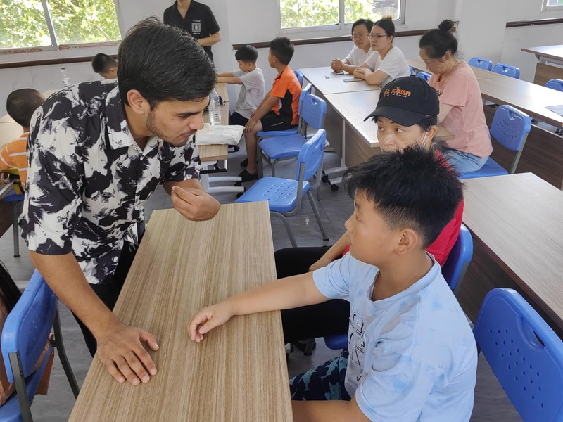 在教学环节中,志愿者聚焦日常问候用语,“Hello”“How are you!”、“I'm fine, thank you.”等简单对话,志愿者一边示范标准发音,一边引导孩子们跟读。随后开展的一对一场景演练,更是让学习氛围愈发浓厚。起初,不少小朋友面对外国志愿者略显羞涩和拘谨,在志愿者的温柔鼓励与家长的耐心引导下,他们渐渐放下顾虑,主动举起小手参与互动。针对发音不标准的问题,志愿者们俯下身来逐字纠正,用夸张的口型示范、有趣的肢体语言辅助,让孩子们在轻松愉悦中掌握了知识点。