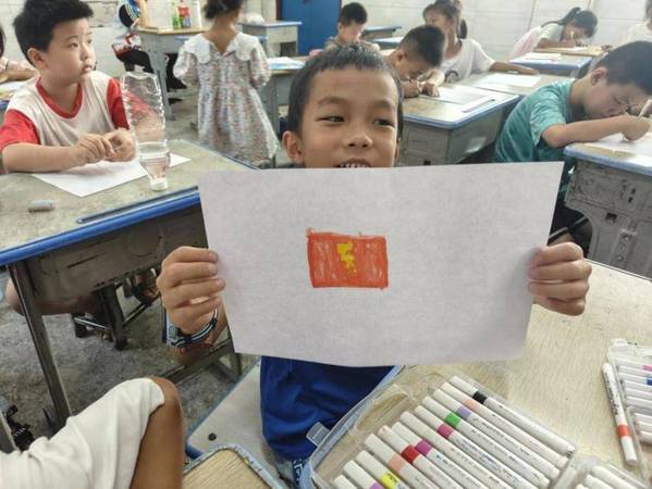 (孩子们与自己绘制的少先队旗的合影)