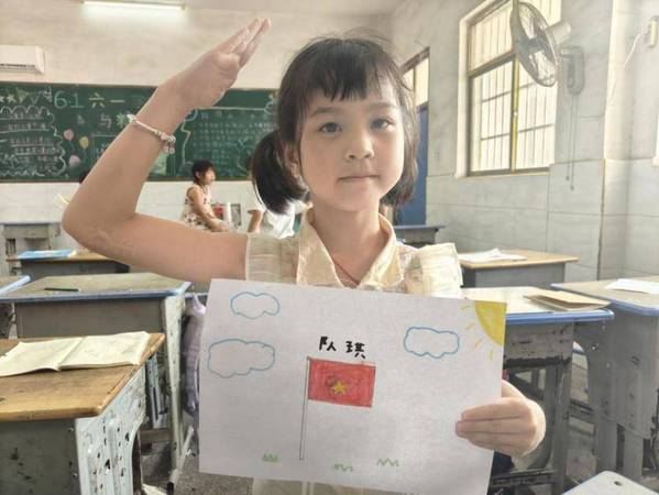 课堂最后,为强化学习成果,课堂设置“我心中的队旗”创意绘画环节。学生在实践队指导下,用彩笔勾勒队旗轮廓,以金黄填涂星星火炬。一幅幅充满童真的画作中,既有对旗帜元素的精准还原,也不乏“红领巾飘扬在太空”“少先队员守护青山绿水”等天马行空的想象。作品完成后,孩子们骄傲地举起画作合影,眼神中闪烁着成为少先队员的渴望。