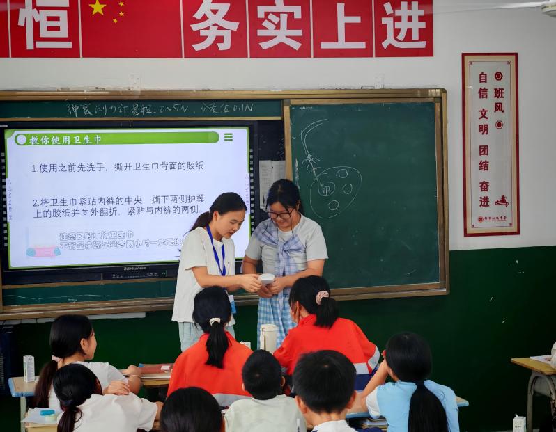 支教老师宗庭竹和学生一起演示卫生巾的正确使用方法。程晓丹供图