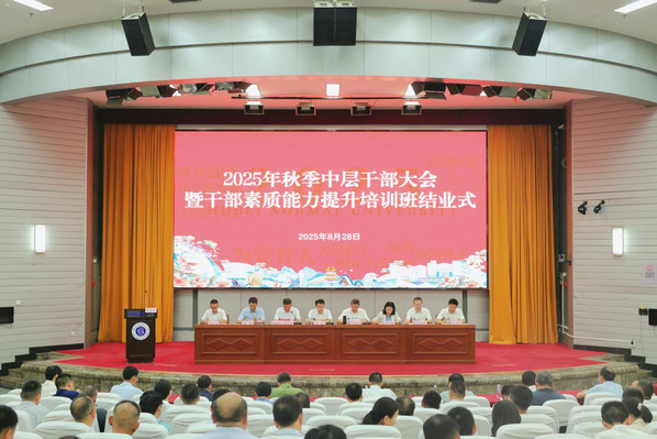 本网讯 8月28日上午,学校召开2025年秋季中层干部大会暨干部素质能力提升培训班结业式,旨在深入贯彻落实党的二十大和二十届三中全会精神,总结2025年上半年和暑假工作,安排部署下半年重点工作。全体在家校领导、全校副处级以上干部参加会议。校党委副书记马列军主持会议。