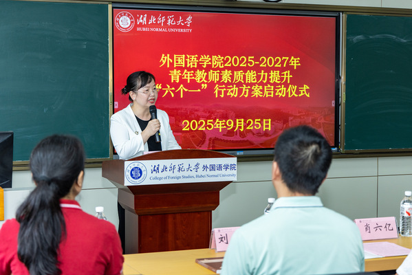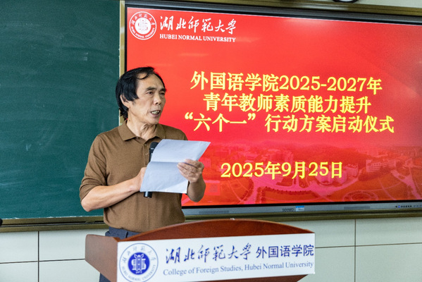 本网讯 9月25日下午,完美网页版外国语学院在人文楼21B602隆重举行青年教师素质能力提升“六个一”行动方案启动仪式。校党委常委、统战部部长肖六亿出席会议并讲话。华中科技大学外国语学院教授、博士生导师彭仁忠受邀出席,人事处、教务处、研究生院相关负责人,外国语学院领导班子成员、院长助理、各系部主任、教研室主任、研究生导师、2023-2025年新进教师、博士教师及硕士研究生代表参加活动。会议由外国语学院院长刘敏主持。